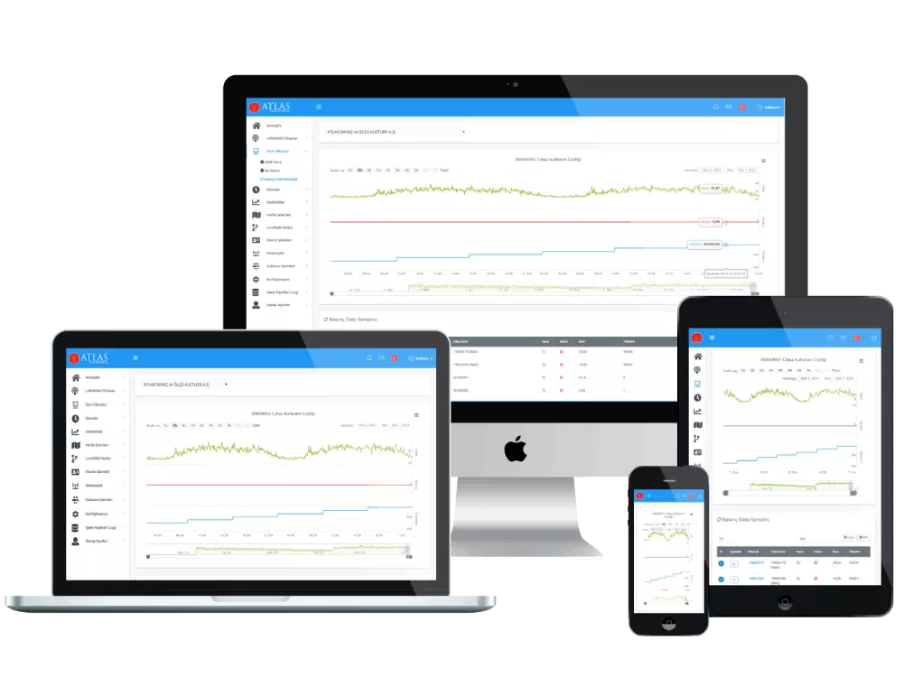 Bu çözümlerin hepsini atlasserver uygulaması online olarak Atlas Sayaç ürünleri için sağlamaktadır. Bu ürünler ve ürün gamı proje bazlı ve ürün bazlı olarak arge tarafından sizin için özelleştirilebilir. Bu sayede Atlas ürünleri ile esnek bir şekilde projelerinizi tasarlamanız sağlanır. Atlas server ile cihazlarınızdan bilgi toplayabilir, zamanlanmış ve anlık görev verebilir, cihazlarınız eski verilerine ulaşabilir aynı zamanda cihazlarınızı harita üzerinden yönetmeniz sağlanır. Atlas server’ın gelişmiş kullanıcı dostu arayüzü ile tüm bunları sadece bir kaç tık ile gerçekleştirebilirsiniz.